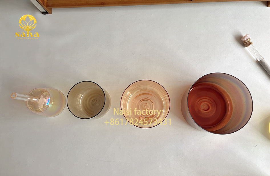 这套混搭套系水晶钵从左到右颜色分别是浅桔金手持水晶钵、透明浅茶色、透明茶金、透明红棕。以下是根据颜色寓意、脉轮以及行星角度对这套水晶钵的介绍: