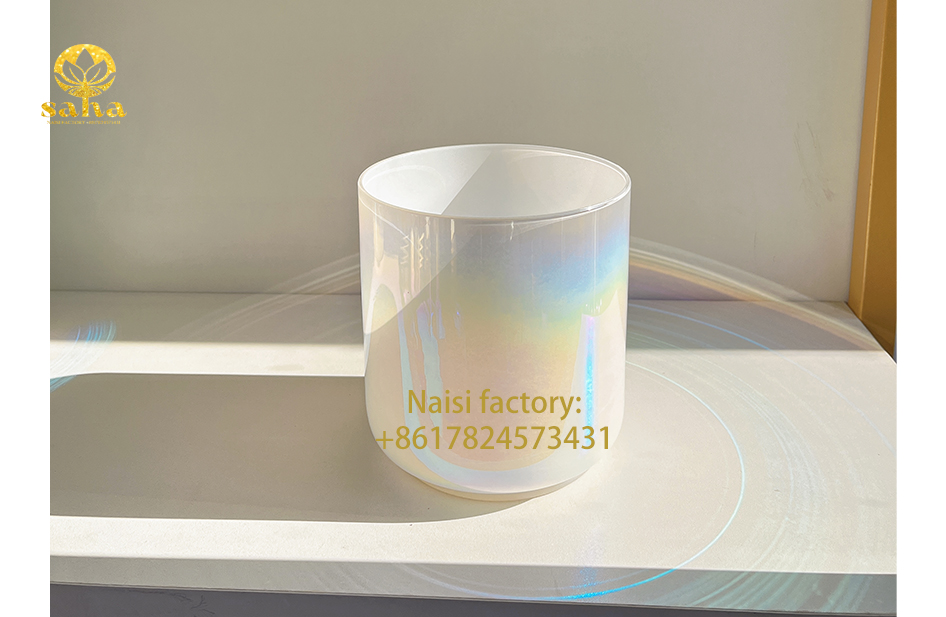 这款水晶钵的颜色是一种柔和的白色,带有一些彩虹般的光泽,这种颜色给人一种纯净、宁静和神圣的感觉。这种水晶钵通常被称为“彩虹水晶”或“虹彩水晶”,因为它们在光线照射下能够反射出多种颜色的光晕。