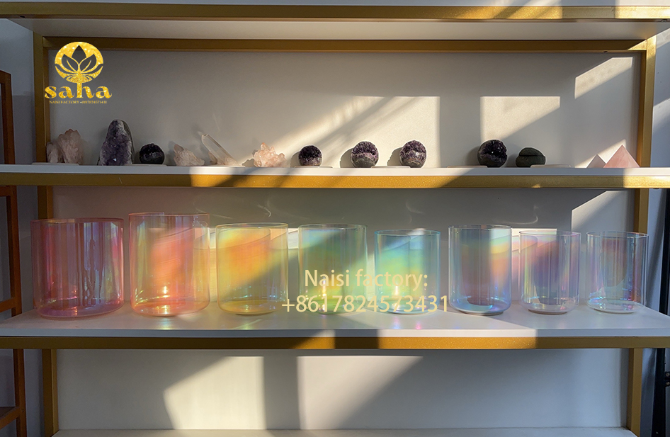 这套八色水晶钵从左到右的颜色分别是透明红色、透明桔色、透明黄色、透明绿色、透明天蓝色、透明宝蓝色、透明紫色和透明。这些颜色可以与脉轮系统和行星能量相联系,为水晶钵赋予更丰富的意义: