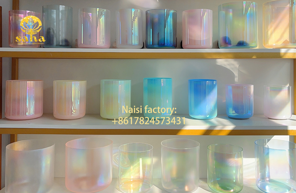 这套七麦轮水晶钵的颜色从右往左分别是透明渐变白色、白色渐变天蓝、天蓝渐变蓝绿、蓝绿渐变淡奶绿、淡奶绿渐变浅黄、浅黄渐变奶桔、奶桔渐变奶粉。这些颜色可以与脉轮系统和行星能量相联系,为水晶钵赋予更丰富的意义: