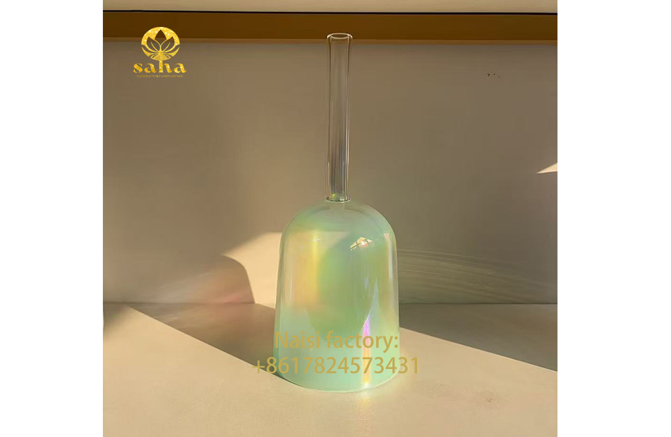 整体效果:整个水晶钵的颜色设计旨在创造一种和谐、平衡的感觉。奶绿色到透明黄绿色的渐变,不仅美观,还可能有助于在使用水晶钵进行冥想或声音疗法时,增强其效果。