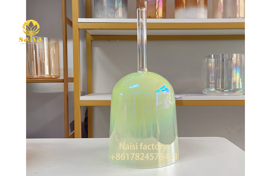 整体效果:整个水晶钵的颜色设计旨在创造一种和谐、平衡的感觉。透明黄绿到实色蓝绿色的渐变,不仅美观,还可能有助于在使用水晶钵进行冥想或声音疗法时,增强其效果。