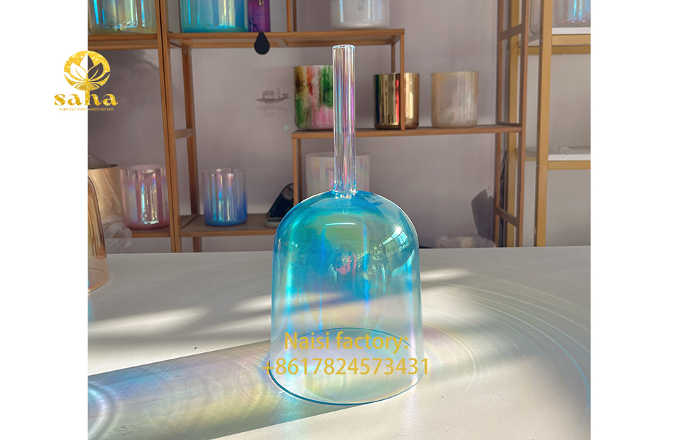 整体效果:整个水晶钵的颜色设计旨在创造一种和谐、平衡的感觉。透明到透明天蓝色的渐变,不仅美观,还可能有助于在使用水晶钵进行冥想或声音疗法时,增强其效果。