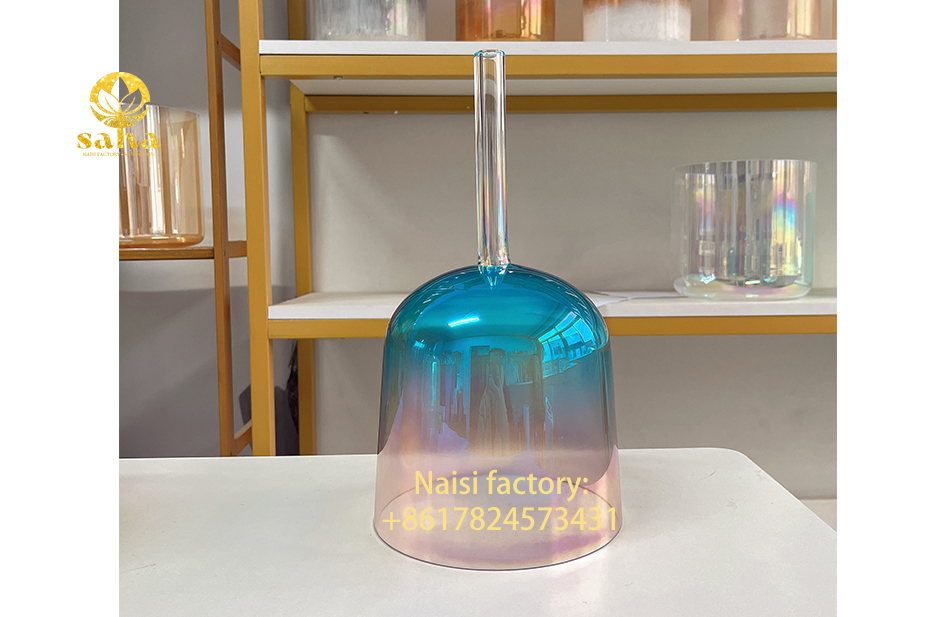 整体效果:整个水晶钵的颜色设计旨在创造一种和谐、平衡的感觉。透明紫红和天蓝的结合,不仅美观,还可能有助于在使用水晶钵进行冥想或声音疗法时,增强其效果。