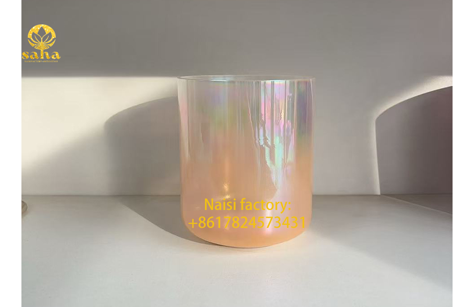 透明渐变橙白色的水晶钵是一种非常独特且引人注目的音疗水晶钵。这种颜色的渐变效果为水晶钵增添了一种柔和而生动的美感。以下是这种颜色组合可能带来的一些感觉和效果: