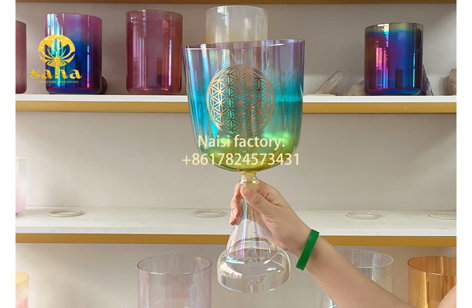 Flower of Life Pattern: The crystal bowl is engraved with the Flower of Life pattern, an ancient symbol often considered a geometric blueprint of the universe, representing the cycle of life and cosmic harmony. This pattern is believed to enhance the spiritual meaning of the crystal bowl, promoting inner peace and self-discovery for the user.