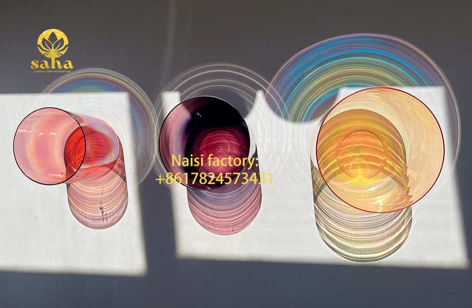 This set of crystal bowls features three colors from left to right: transparent light red, translucent grape purple, and tea gold. Below is an introduction to this set of crystal bowls based on color symbolism, chakras, and planetary aspects: