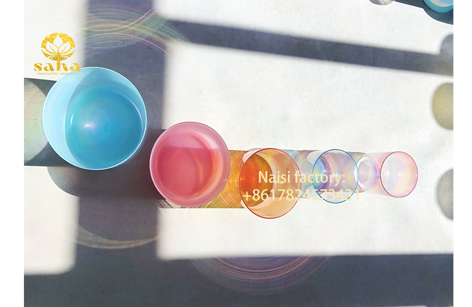 This set of crystal bowls, from left to right, features solid pale sky blue, solid pink, solid tea gold, clear sky blue, and clear pink. Below is an introduction to this set of crystal bowls based on color symbolism, chakras, and planetary aspects: